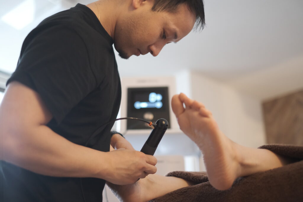 こうした深い場所で起きている癒着を剥がしてくれるのが、体外衝撃波を使った衝撃波筋膜リリースです。